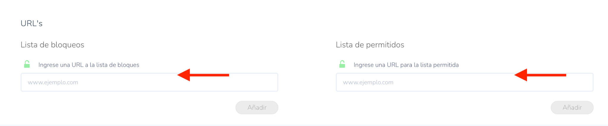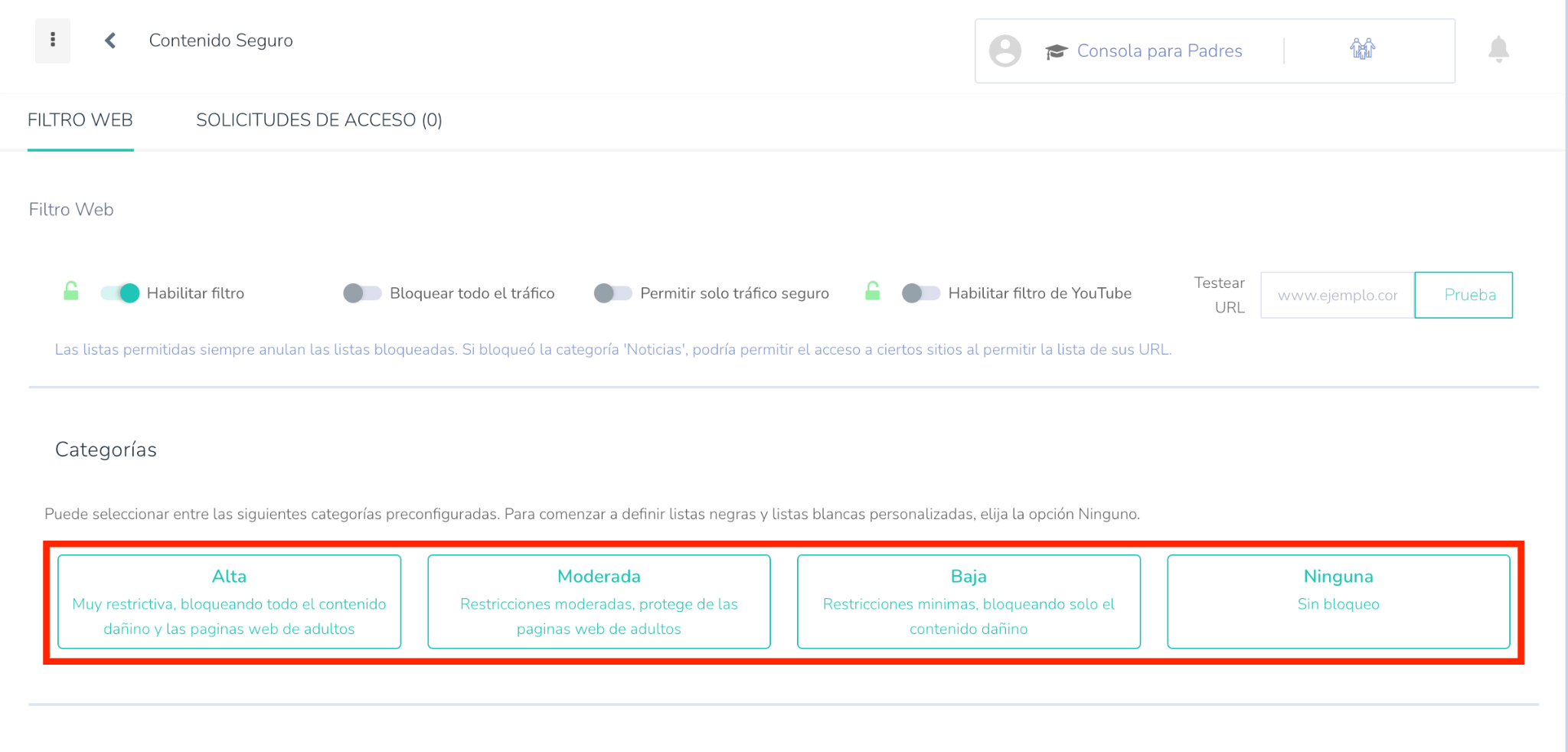 - Permitir solo tráfico seguro: Solo permite las URLs web que estén estipuladas en la Lista de URLs Permitidas.