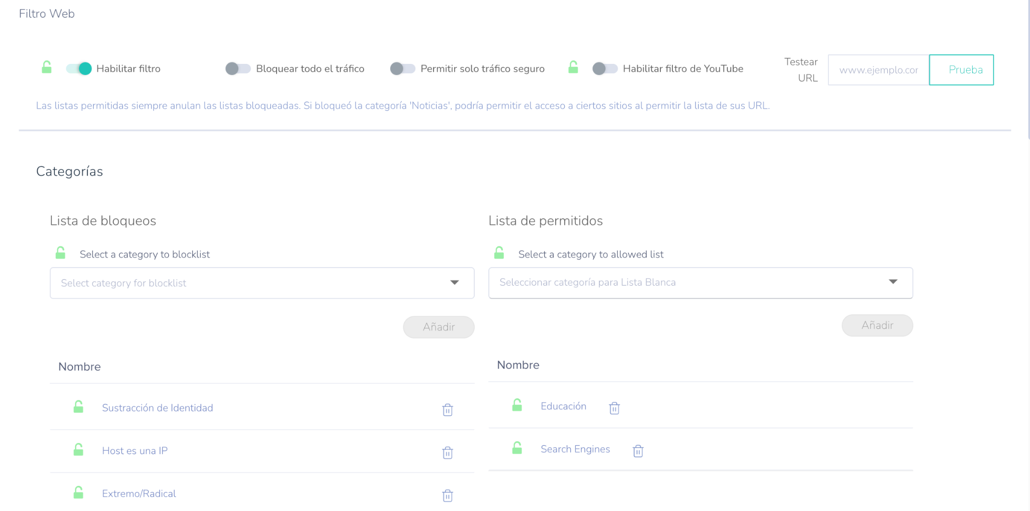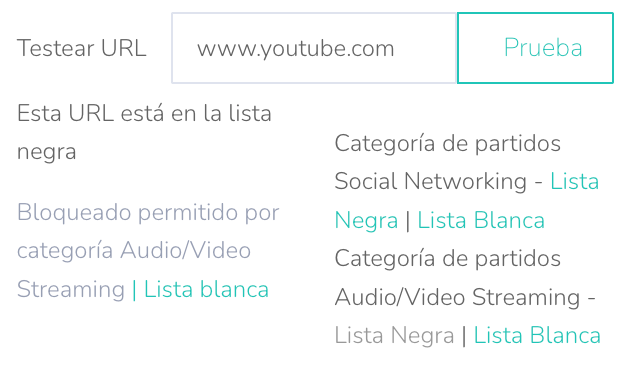 - Testear URL: Podrá probar una URL para ver si será bloqueada o permitida por el filtro web aplicado, o a qué categoría pertenece dicha URL. También podrá bloquear o permitir la categoría desde aquí.