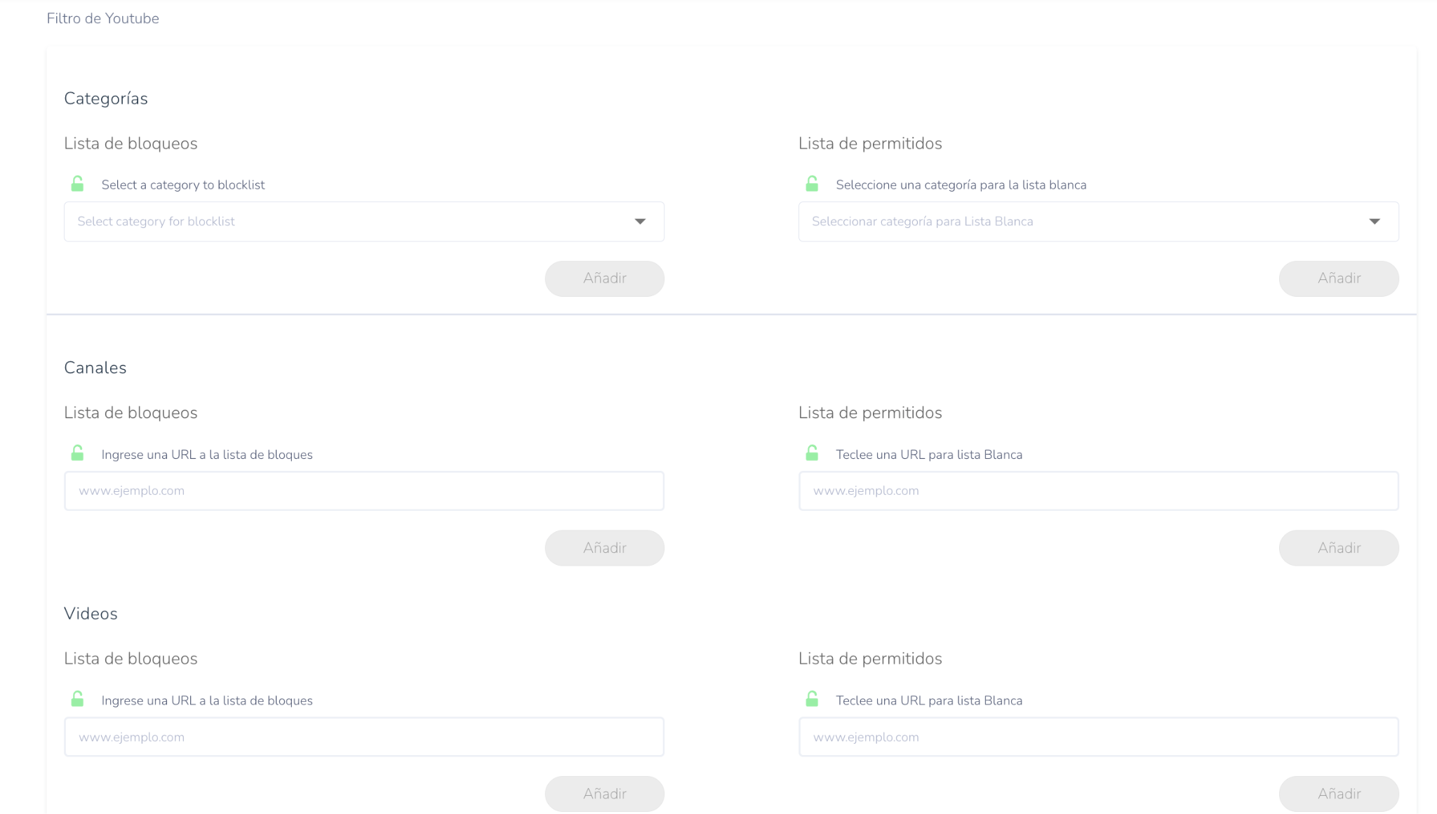 Habilitar filtro de YouTube: Con el filtro de YouTube, puede configurar categorías, canales y URLs de videos específicos para que sean bloqueados o permitidos.