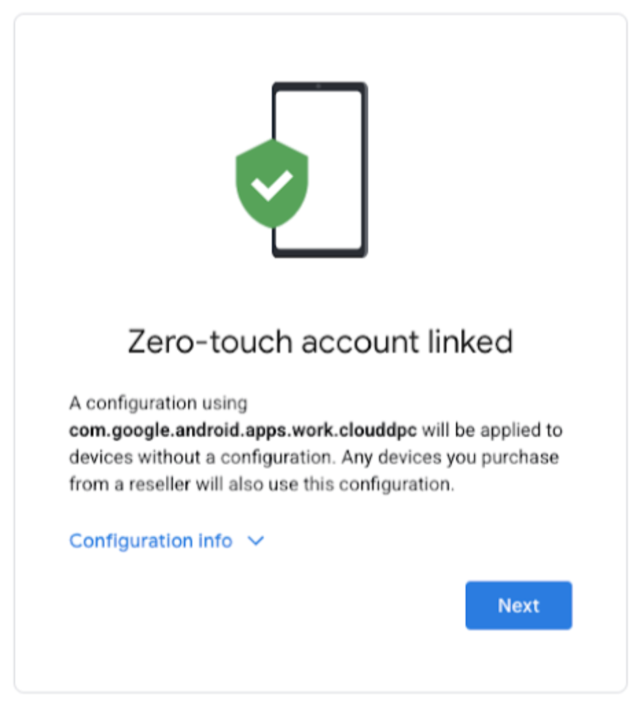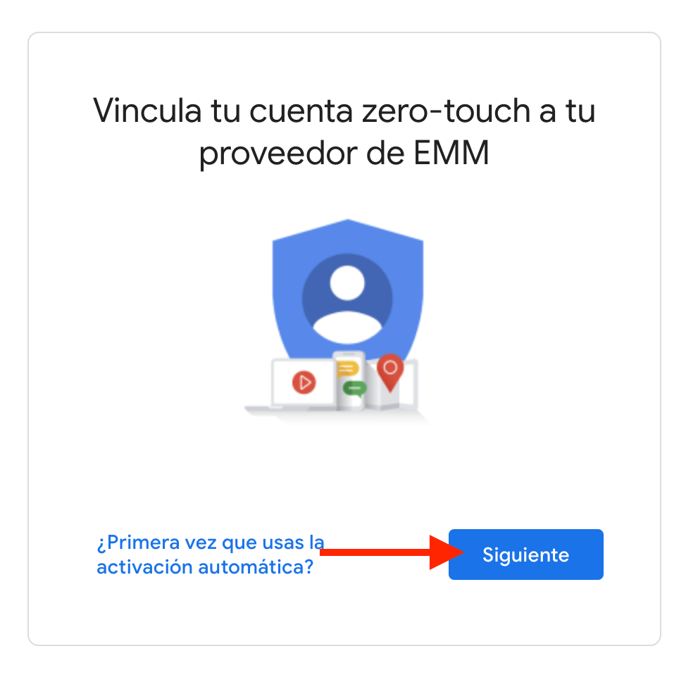 - Navegue hasta la opci贸n para vincular su cuenta de Zero-Touch con su proveedor de EMM y seleccione Siguiente.