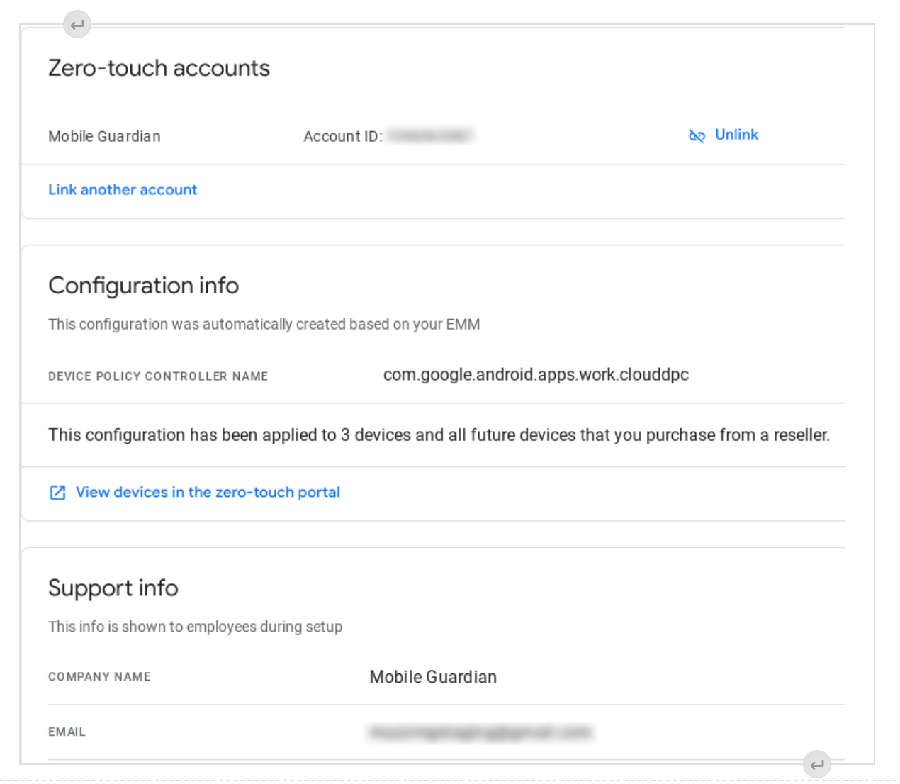 隆脡xito! Su cuenta de Zero-Touch se ha vinculado correctamente. Ahora se muestra un resumen de la cuenta vinculada en el panel de control de Mobile Guardian: