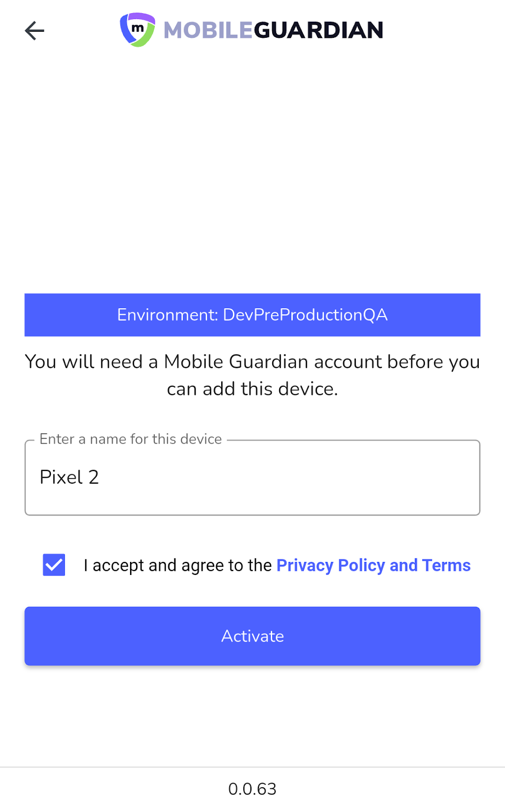 Tras la aceptaci贸n de los T茅rminos de Servicio iniciales por parte del estudiante, la siguiente pantalla mostrar谩 el Entorno (Environment) de destino del dispositivo. El estudiante deber谩 entonces asignar un nombre al dispositivo y marcar una casilla para reconocer y aceptar la Pol铆tica de Privacidad y los T茅rminos de Mobile Guardian.