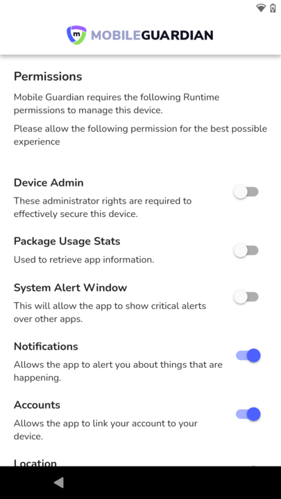 Despu茅s de conceder los permisos, pulse Continuar. La aplicaci贸n de Mobile Guardian se abrir谩 para finalizar el registro. Presione el bot贸n de retroceso para ser redirigido a la pantalla de inicio.