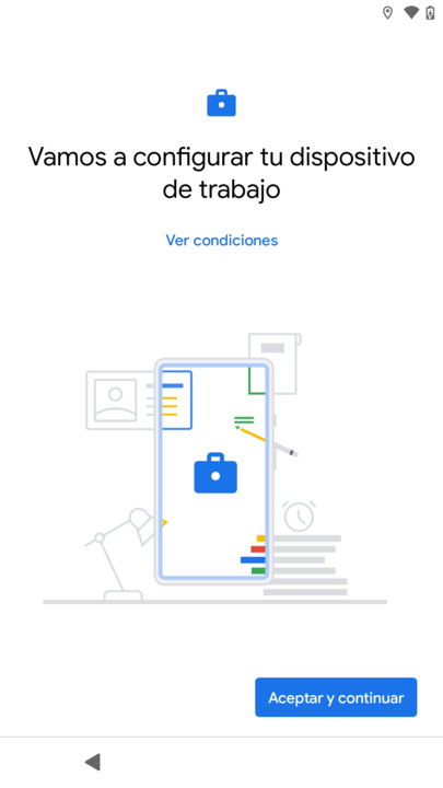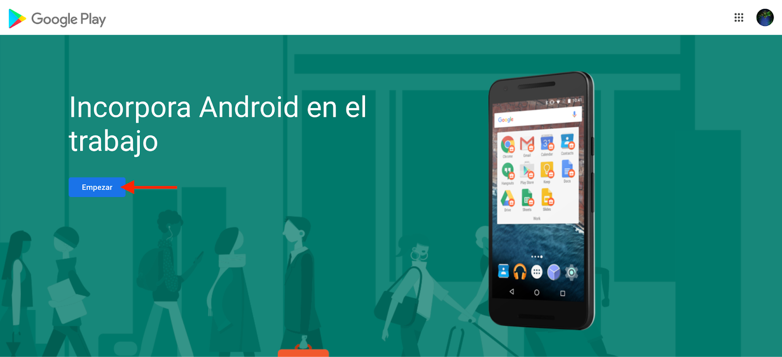 Usted ser谩 redirigido a la p谩gina "Incorpora Android en el trabajo". Inicie sesi贸n con una cuenta de Gmail y haga clic en "Empezar".