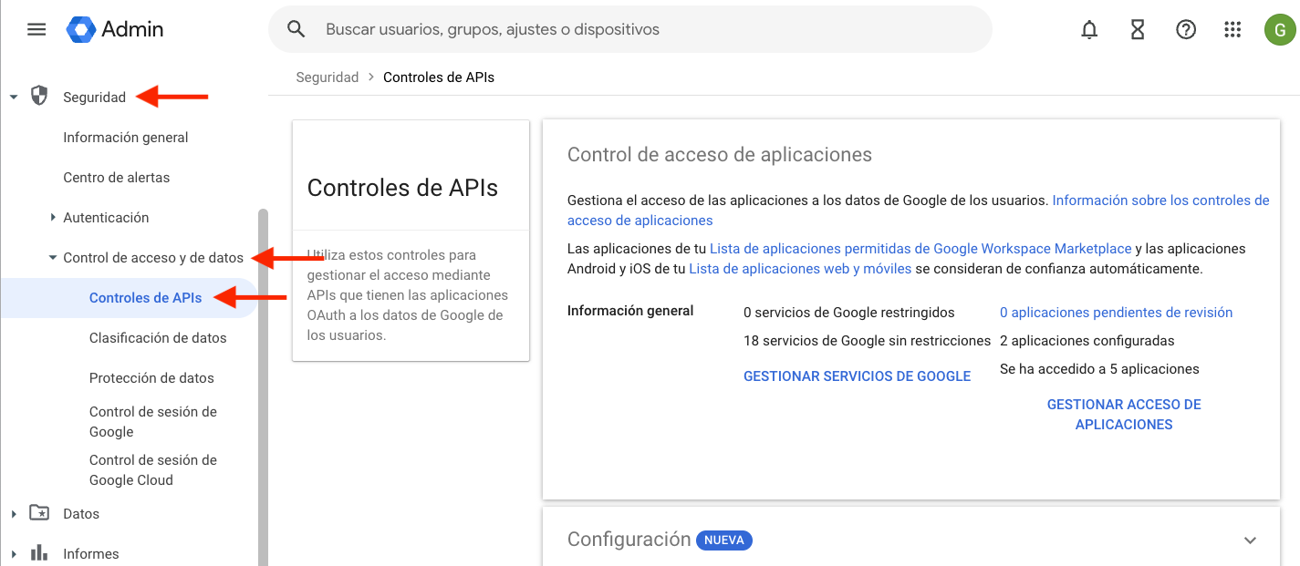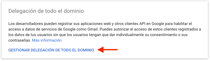 Con la Parte 1 completada, ahora puede pasar a la Consola de administración de Google para configurar los controles de la API y la delegación. Siga los pasos a continuación para continuar: