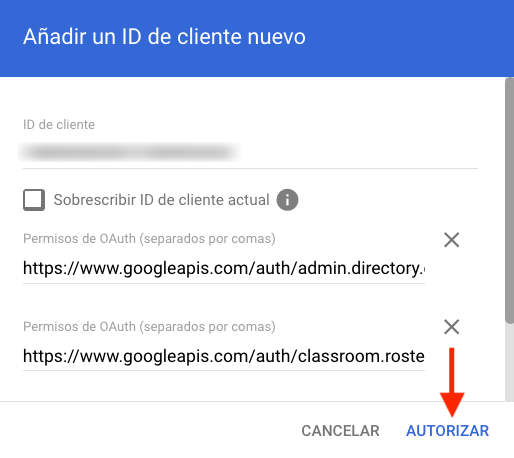 https://www.googleapis.com/auth/classroom.rosters.readonly, https://www.googleapis.com/auth/classroom.courses.readonly, https://www.googleapis.com/auth/classroom.profile.emails, https://www.googleapis.com/auth/classroom.profile.photos- Una vez introducidos, haga clic en Autorizar.