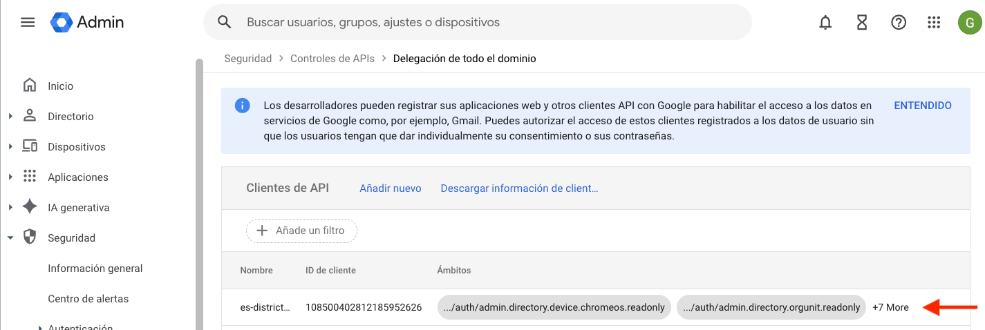 Los alcances de API (API Scopes) a continuación solo deben añadirse si está utilizando las herramientas de gestión de aula (Mobile Guardian Classroom Management Tools) para profesores.