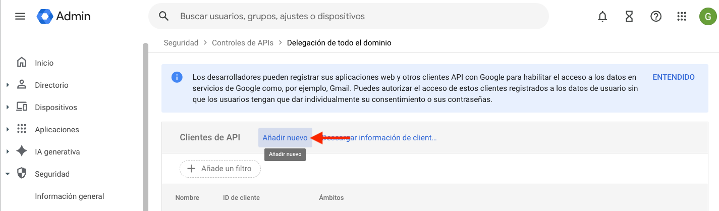 - En la lista de clientes de API, haga clic en Añadir nuevo.