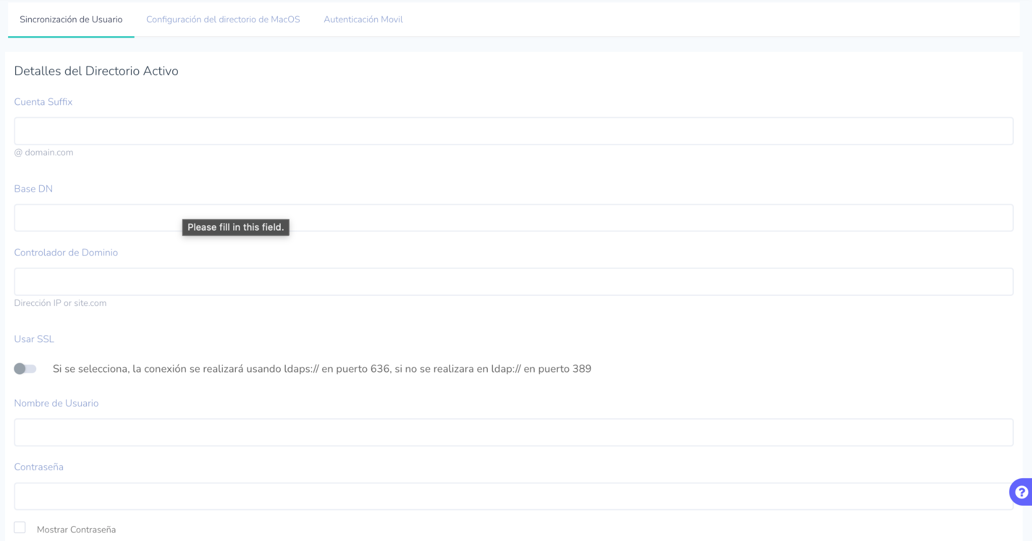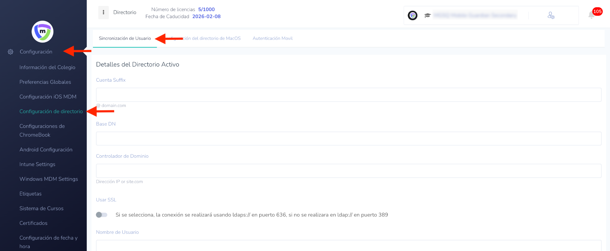 Mobile Guardian necesita acceso al servidor AD del distrito para sincronizar a los usuarios y asignarlos a la escuela correspondiente. Su configuración de AD está disponible en Configuración > Configuración de directorio > Sincronización de Usuario.