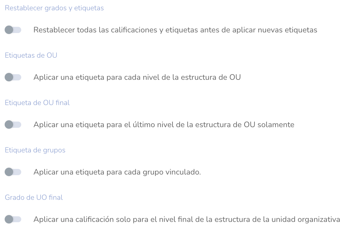 - Configurar etiquetas y grados: seleccione cómo desea que se asignen las etiquetas y los grados. Pruebe la conexión y guarde los cambios.