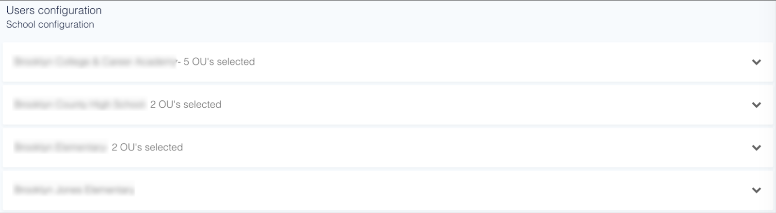 - Cargar Unidades Organizativas (OU): Mobile Guardian cargará todas las OU de su servidor. Seleccione las OU que se asignan a las escuelas de Mobile Guardian y las OU que se asignan a los roles de usuario (administradores, profesores y estudiantes).