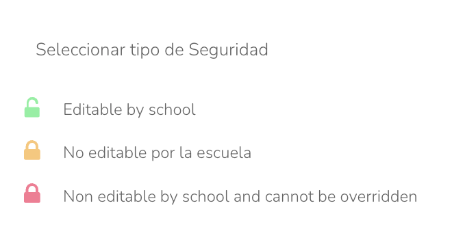 - Candado Ámbar: Restringe los cambios por parte de los administradores escolares, pero permite que la restricción sea anulada por otros perfiles activos.