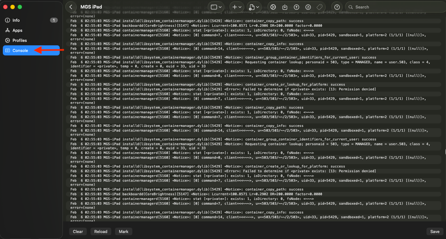 En la nueva ventana que aparece, haga clic en Console (Consola) en el menú de la esquina superior izquierda. Esto mostrará las actividades de registro en vivo de su dispositivo iOS.