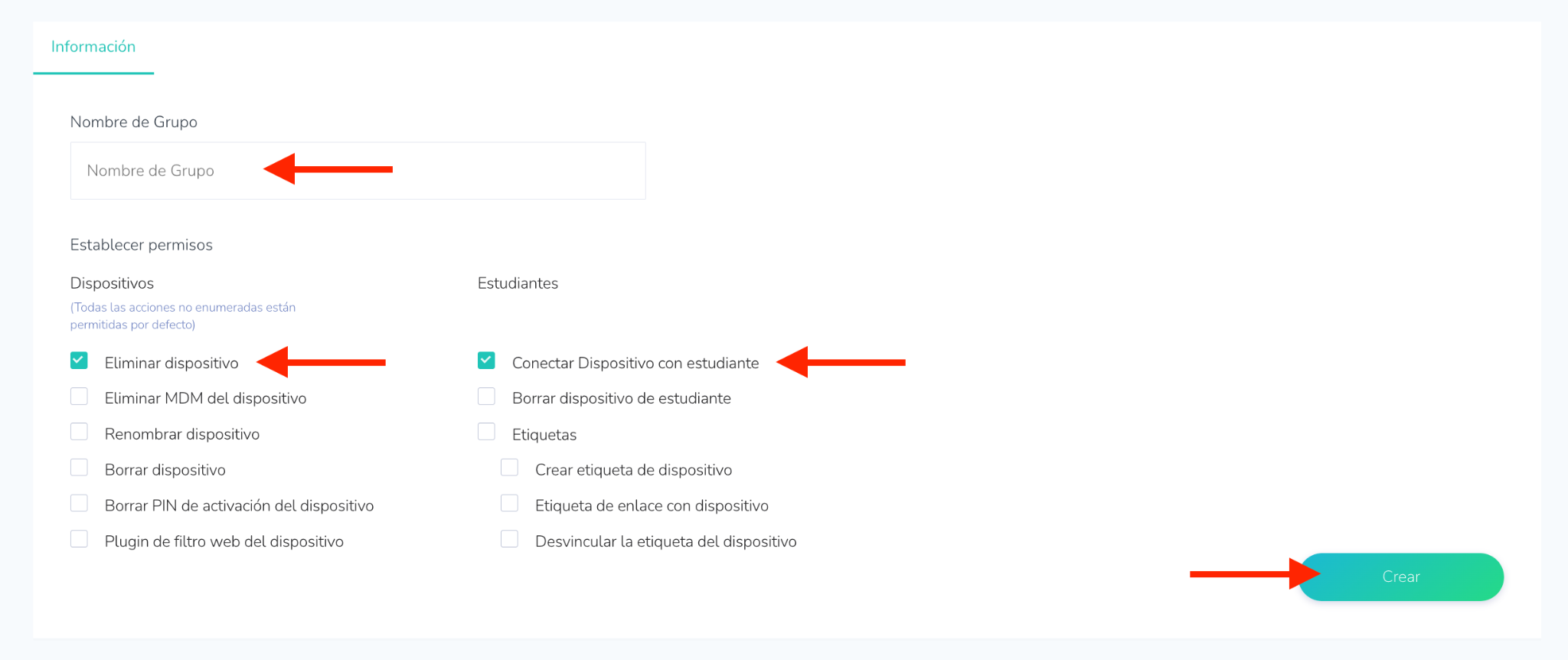- Vinculación de estudiantes: Permisos para vincular estudiantes al grupo.
