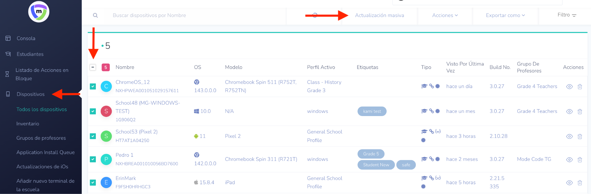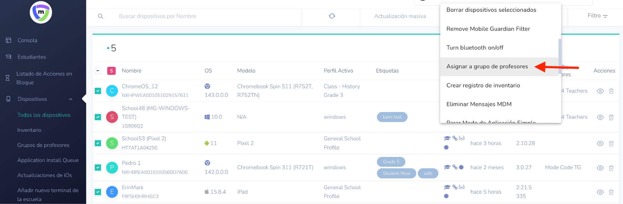 - Seleccione los dispositivos de la lista, haga clic en Acciones y elija Asignar a grupos de profesores en el menú desplegable.