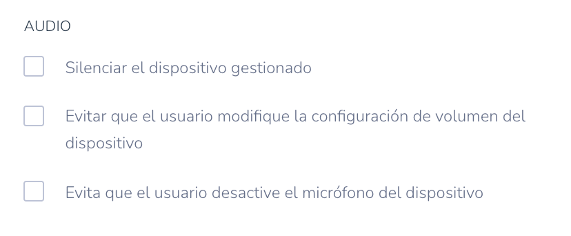 - Silenciar dispositivo gestionado: Controla las funciones de audio del dispositivo, incluyendo el silencio del dispositivo y evitar que los usuarios ajusten la configuración del volumen.