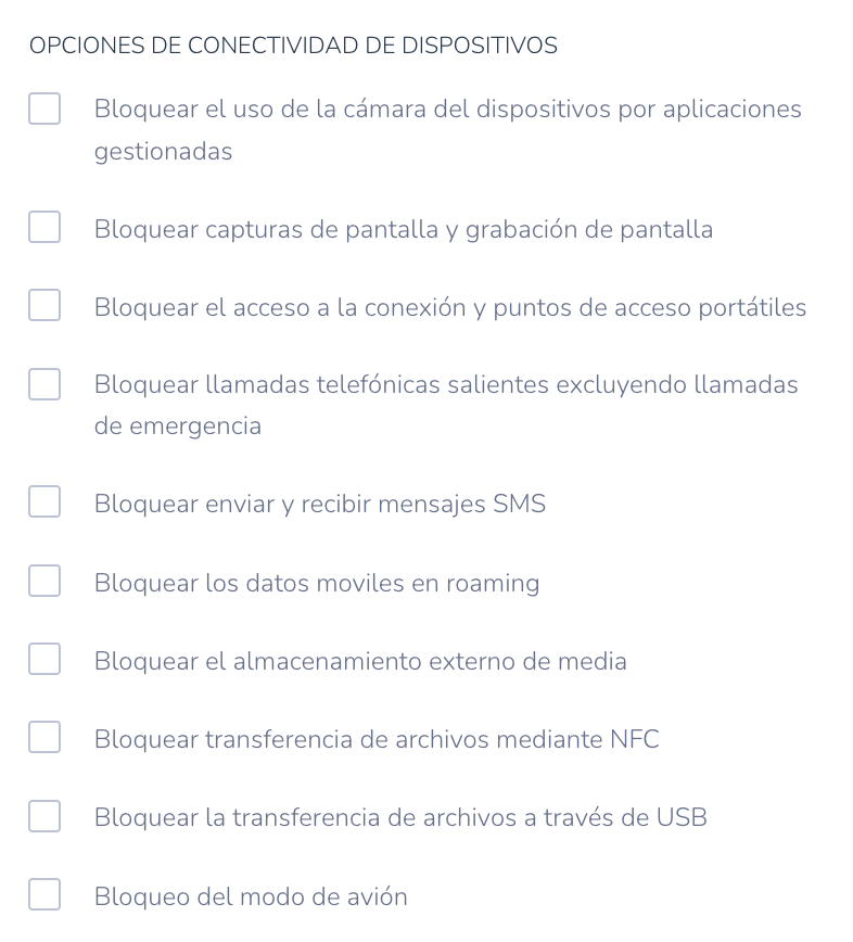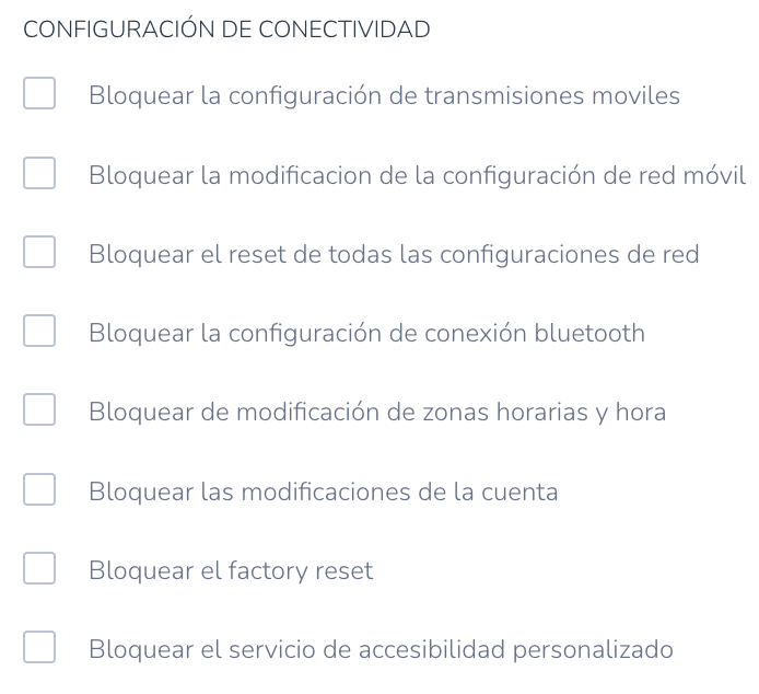 - Bloquear el acceso a la conexión y puntos de acceso portátiles: Evita el uso del dispositivo como punto de acceso (hotspot).