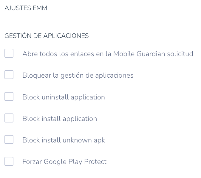 - Bloquear la instalación de APK desconocidos (Block Install Unknown APK): Evita que los usuarios instalen archivos APK.
