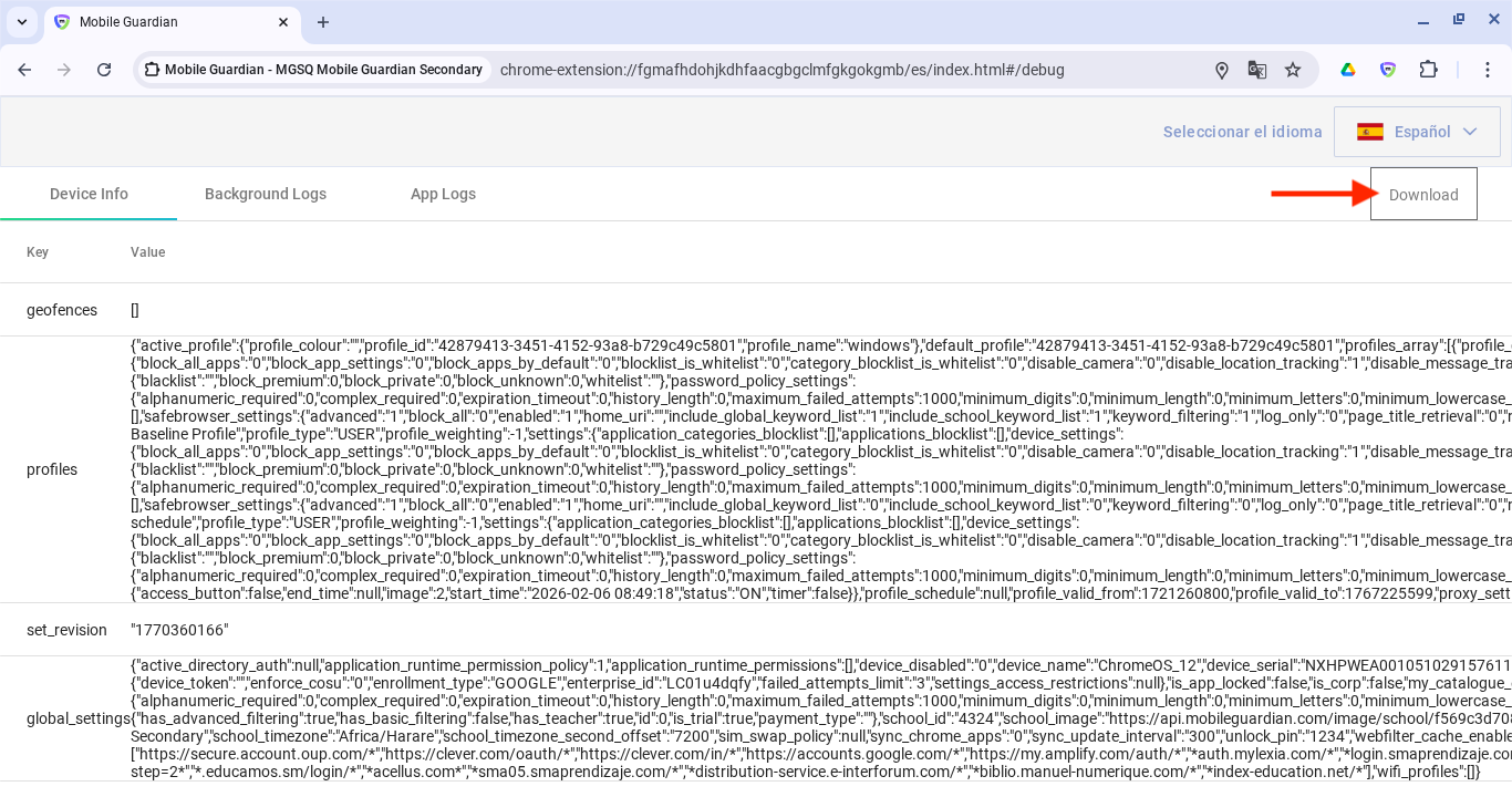 - Una vez en la página de depuración, haga clic en el botón Download para guardar el archivo de registro en su dispositivo.