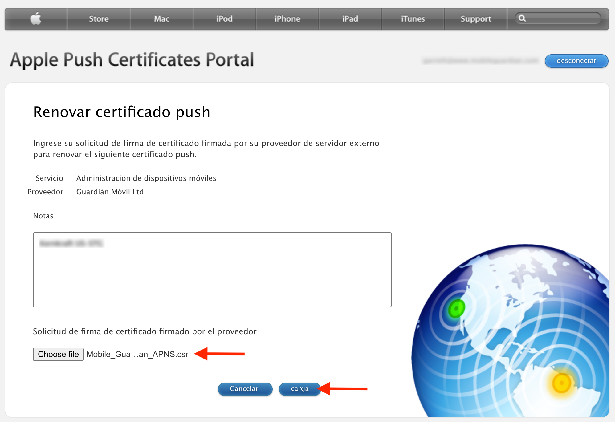 Paso 3: Cargue el certificado APNS en Mobile Guardian
