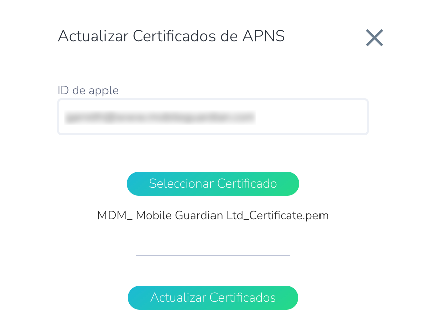 - Ingrese el Apple ID, haga clic en Select Certificate y elija el archivo MDM_Mobile_Guardian_Ltd_Certificate.pem. A continuación, haga clic en Update Certificate.