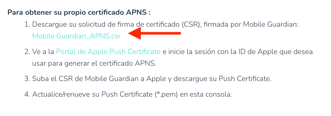 - Descargue la solicitud de firma de certificado (CSR) firmada por Mobile Guardian. Esto descargará un archivo llamado Mobile_Guardian_APNS.csr, el cual deberá cargar más adelante en el Portal de Certificados Push de Apple.