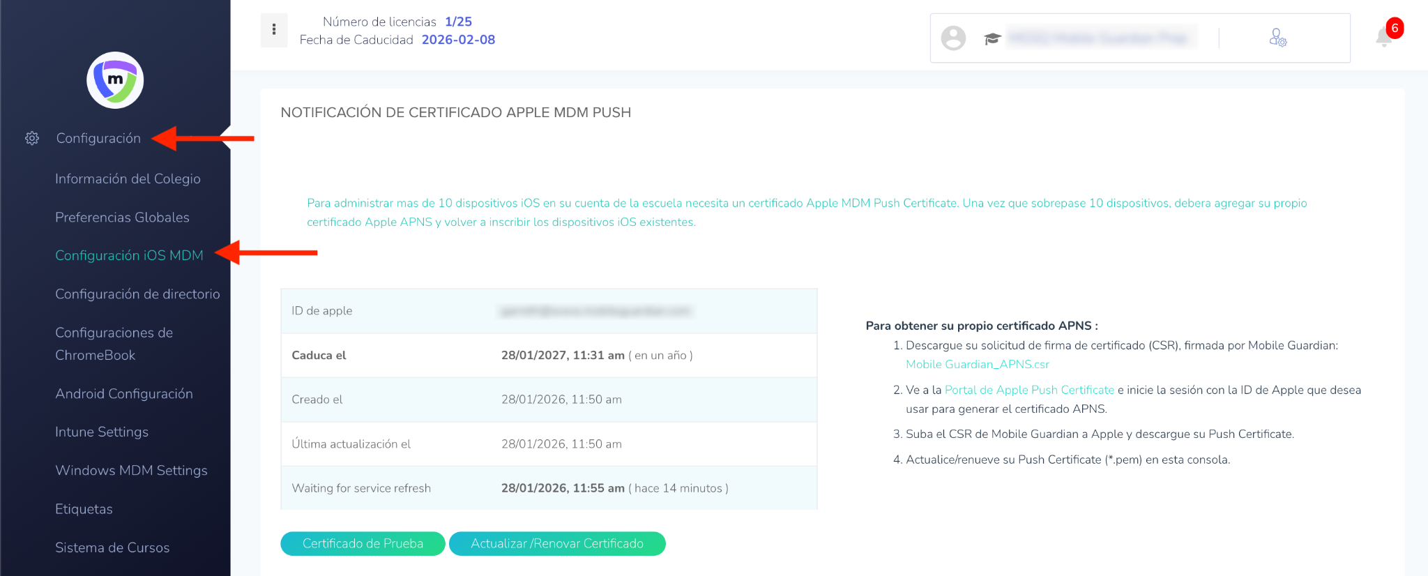 - Mobile Guardian enviará recordatorios cuando el certificado esté próximo a caducar a través de correos electrónicos dirigidos a todos los administradores del panel de control de Mobile Guardian.