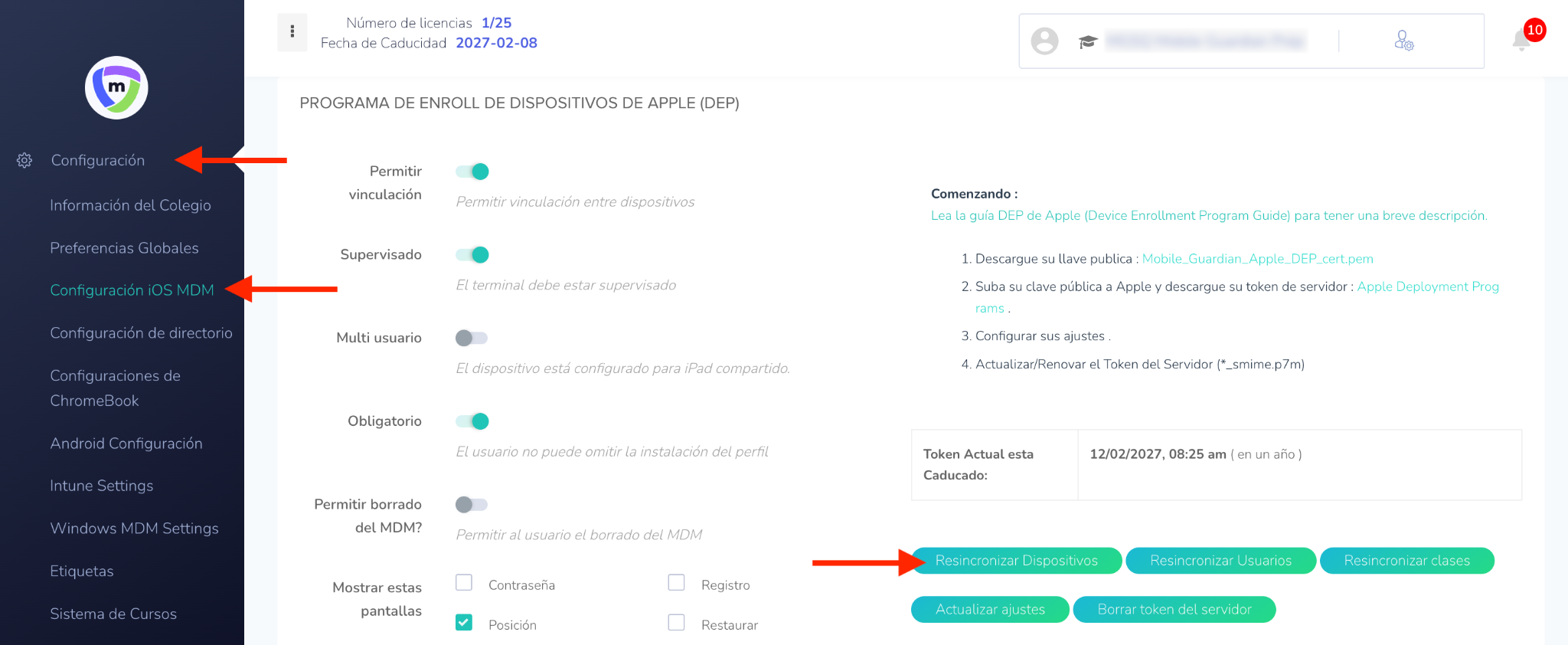 Para asegurar que Mobile Guardian se actualice con cualquier cambio realizado en su servidor de Apple School Manager, es necesario resincronizar los dispositivos.