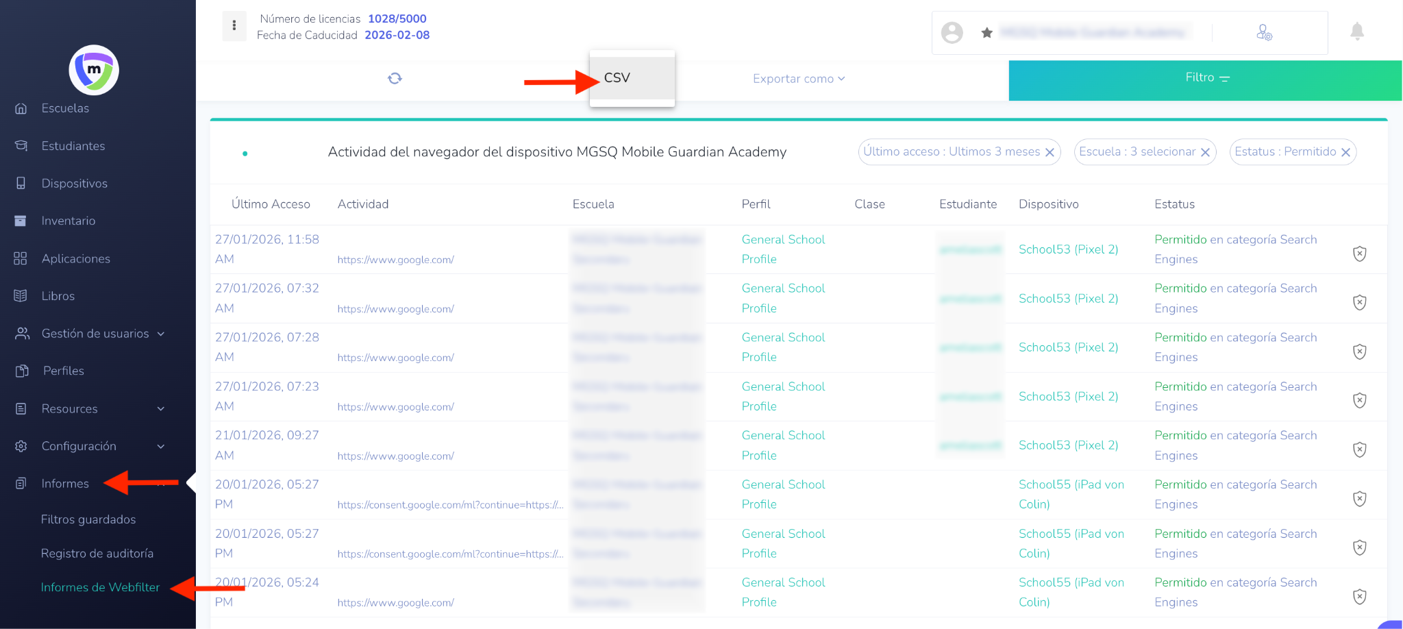 Estos informes ayudan a analizar la actividad del navegador de los estudiantes en todas las escuelas, identificar tendencias y supervisar las visitas recurrentes a sitios web específicos.