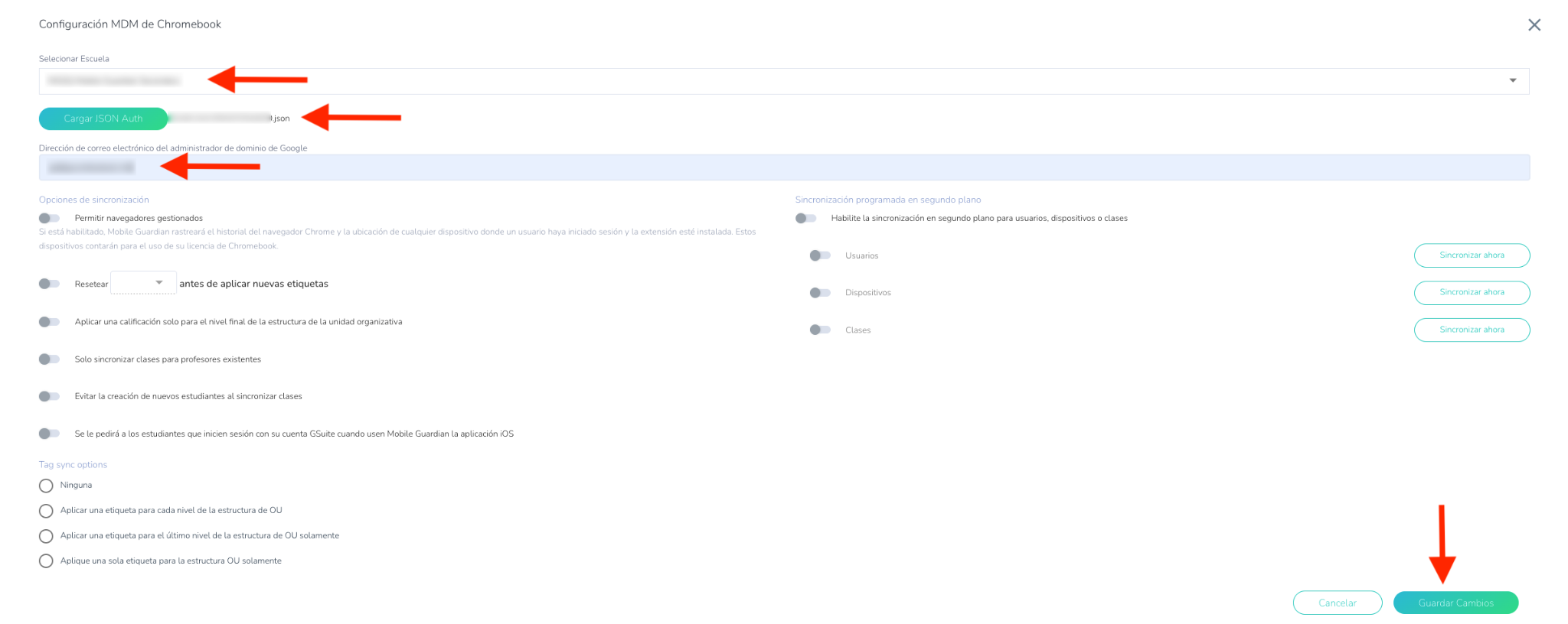 El producto de Distrito de Mobile Guardian permite una gestión centralizada de las configuraciones de Chromebook, lo cual es particularmente útil para distritos escolares con múltiples escuelas que utilizan Chromebooks. Al cargar un archivo de configuración JSON, puede especificar las unidades organizativas (OU) de cada escuela y gestionarlas a nivel de distrito.