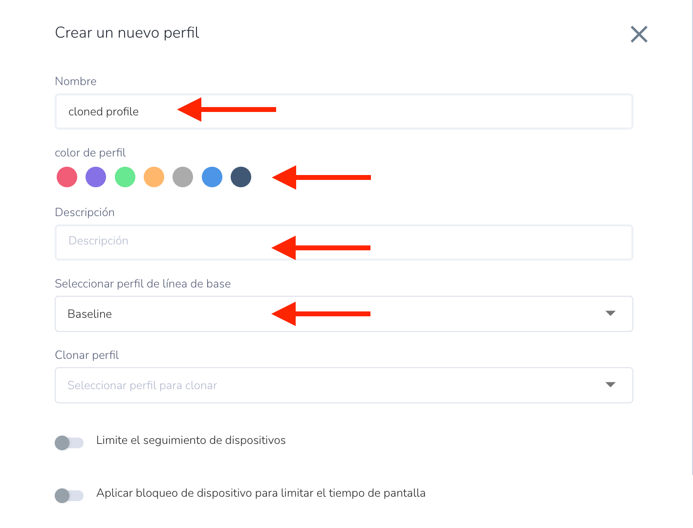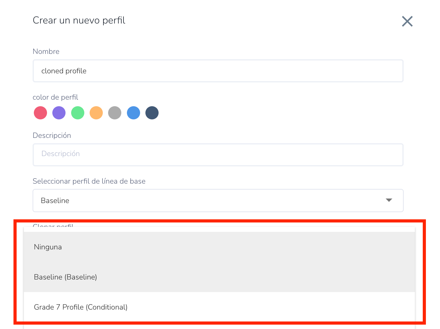 - Perfil base (Baseline) con el que desea asociarlo (opcional)