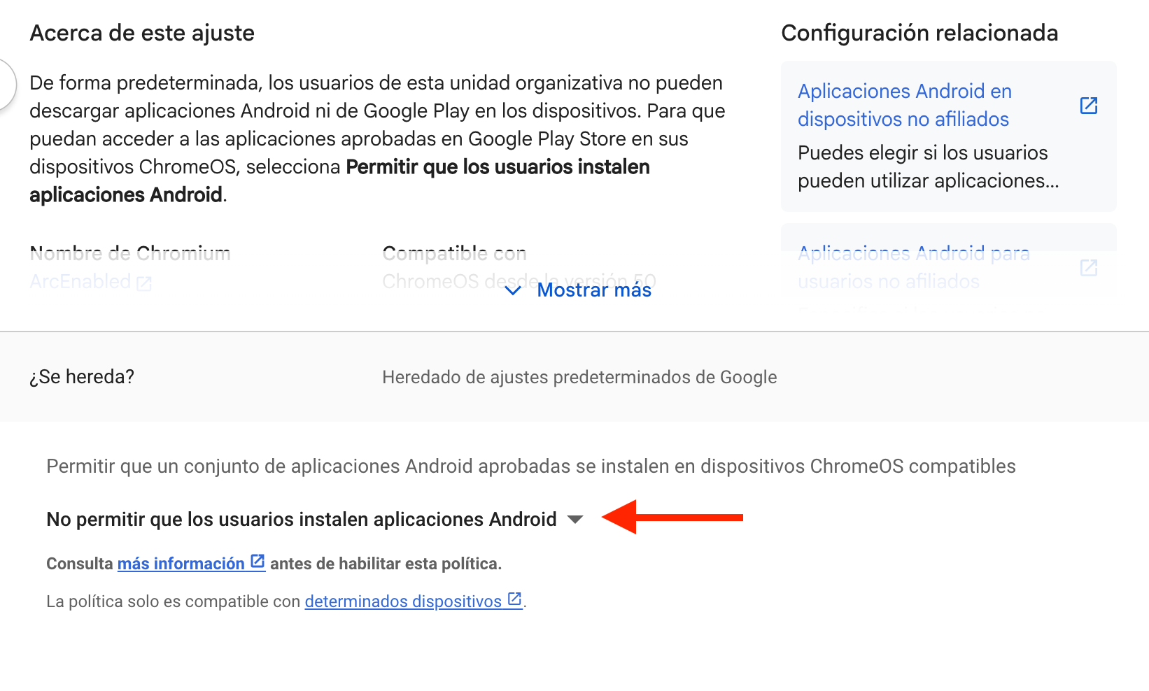 - En Aplicaciones Android en dispositivos Chrome, cambie el comportamiento actual seleccionando No permitir que los usuarios instalen aplicaciones Android en el menú desplegable.