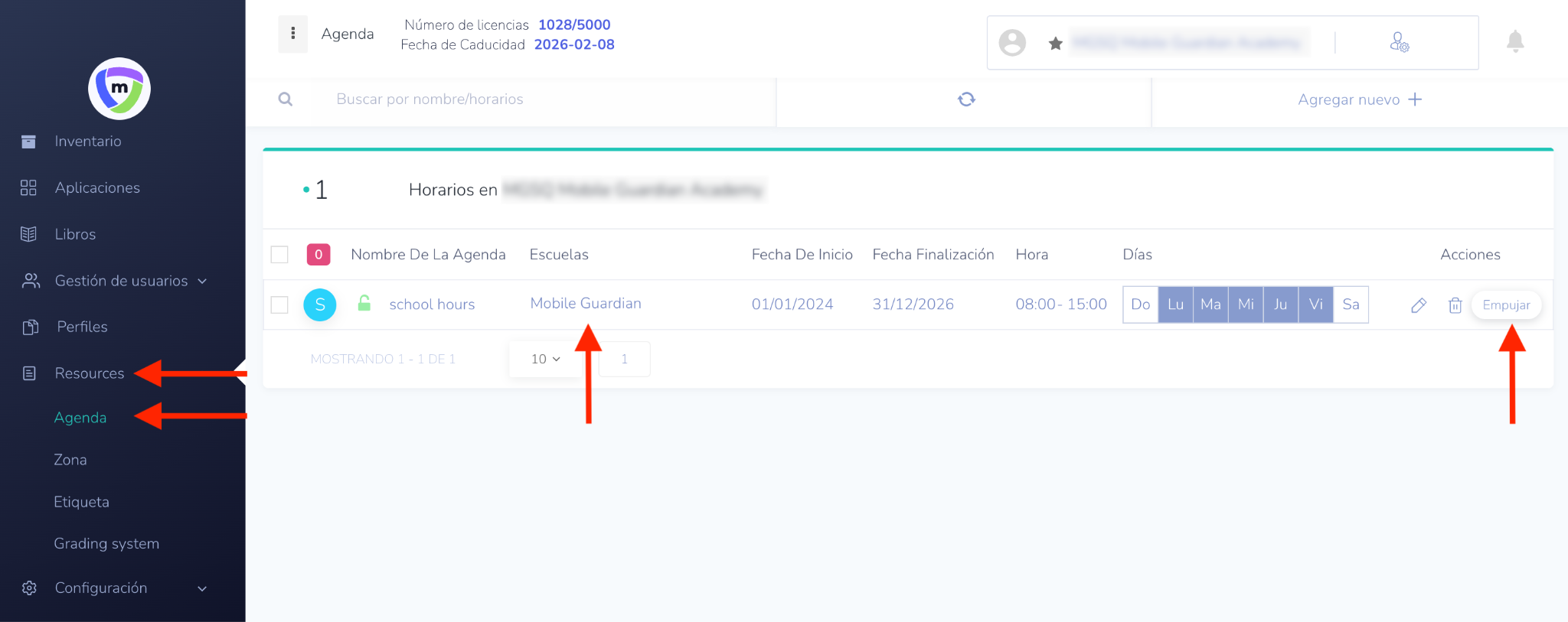 Configurar un horario: Comience creando un horario y enviándolo a todas sus escuelas vinculadas. Puede hacerlo desde el Panel de Distrito en Resources > Agenda.