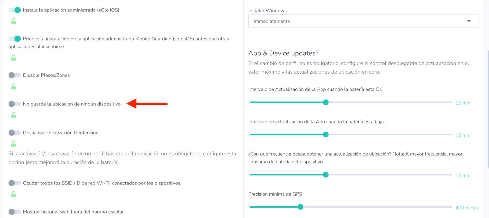 Ubicación habilitada: si el interruptor está desactivado, el seguimiento de ubicación estará habilitado y será visible en el panel de control de Mobile Guardian.