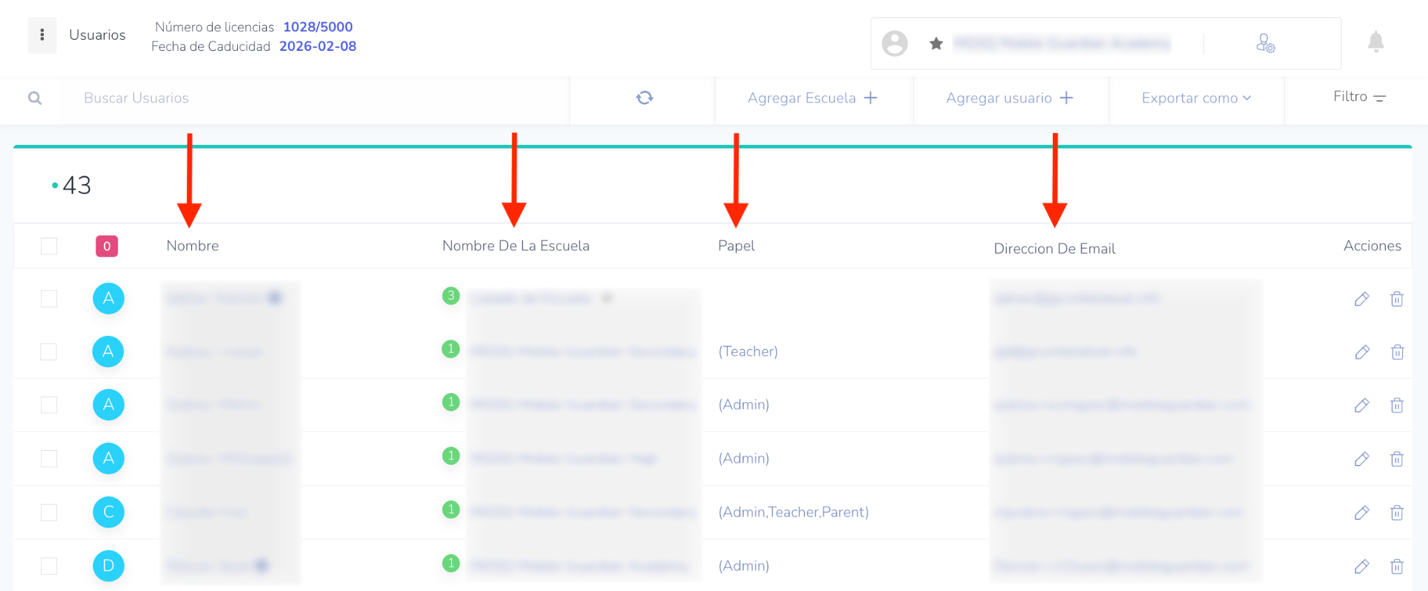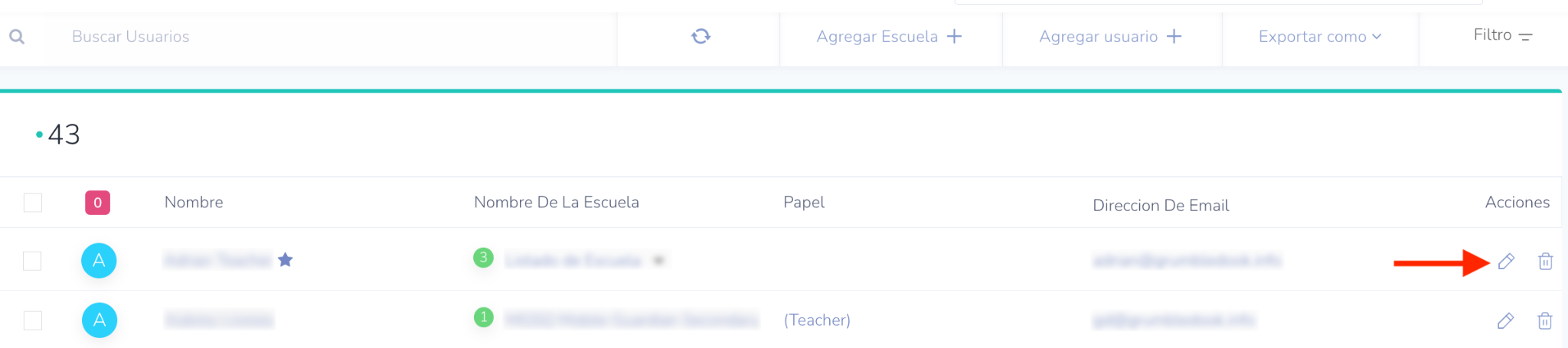 - Aquí verá una lista de usuarios que incluye su nombre (Name), nombre de la escuela (School Name), rol (Role) y dirección de correo electrónico (Email Address).