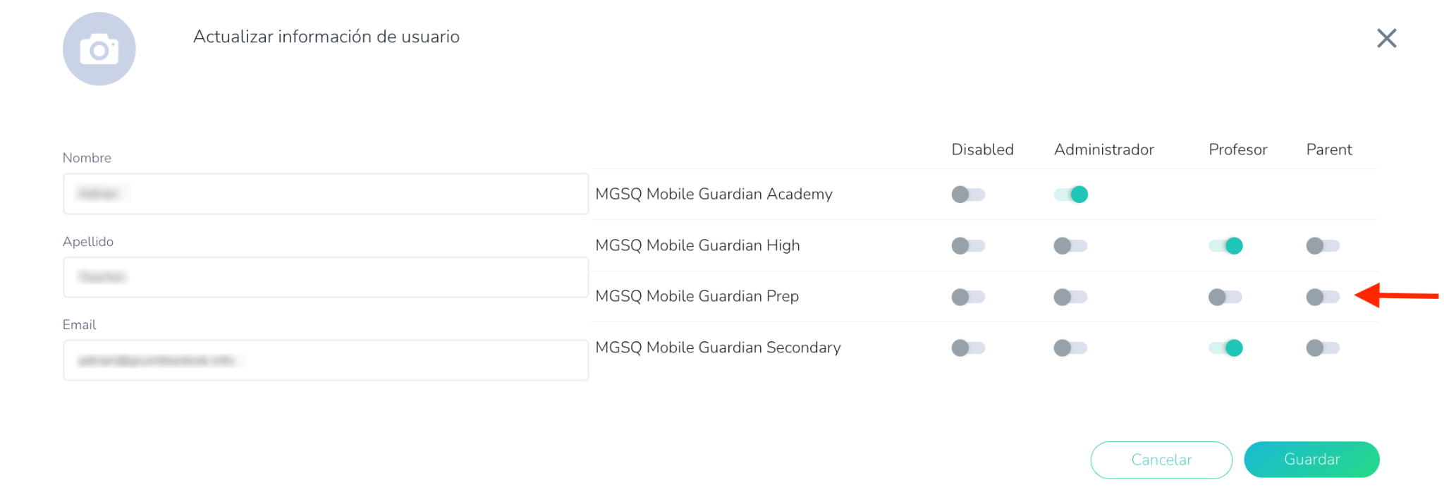 - También puede desactivar al usuario para todas las escuelas del distrito o asignar diferentes roles al usuario para una escuela en particular.