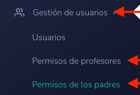 Puede encontrar los permisos de Profesor y de Padres en la sección de Gestión de Usuarios.