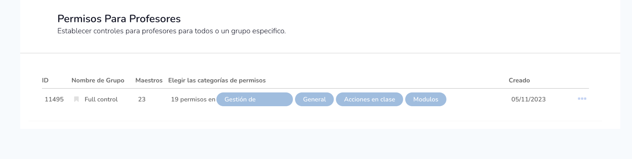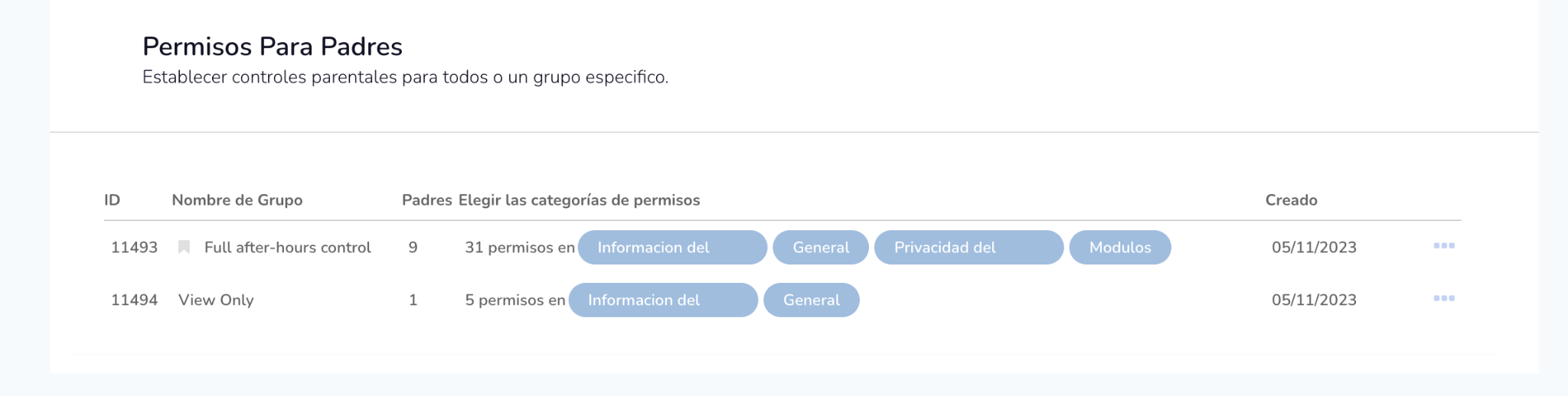 - Grupos específicos por rol: Un usuario solo puede pertenecer a un grupo de permisos por rol y por escuela. Se pueden crear grupos separados para profesores y padres.