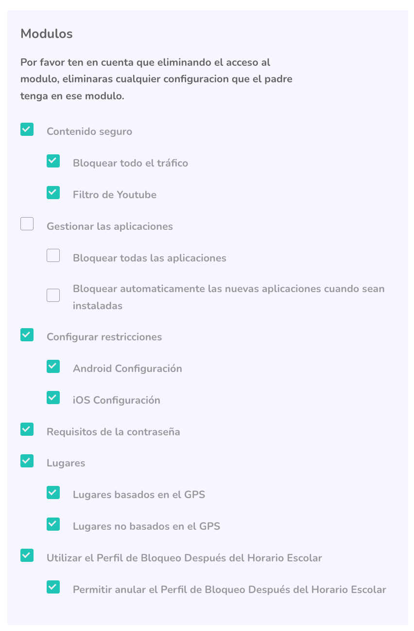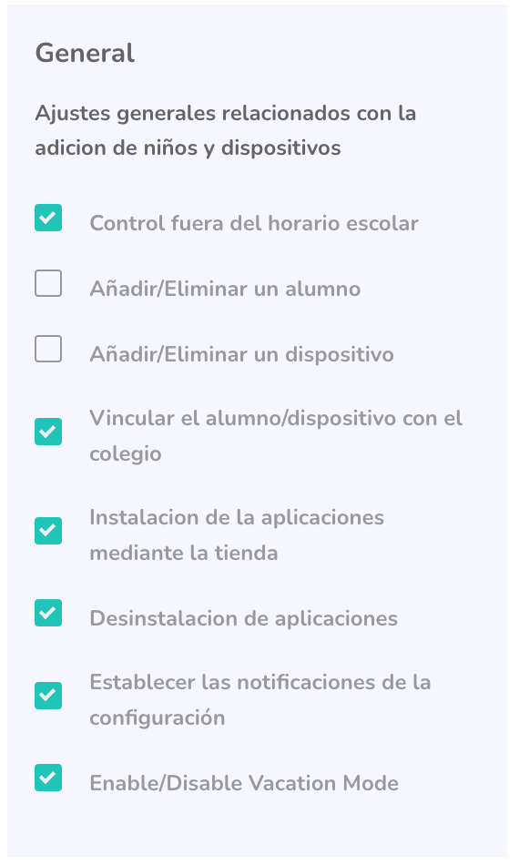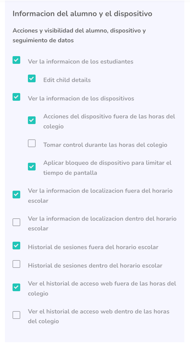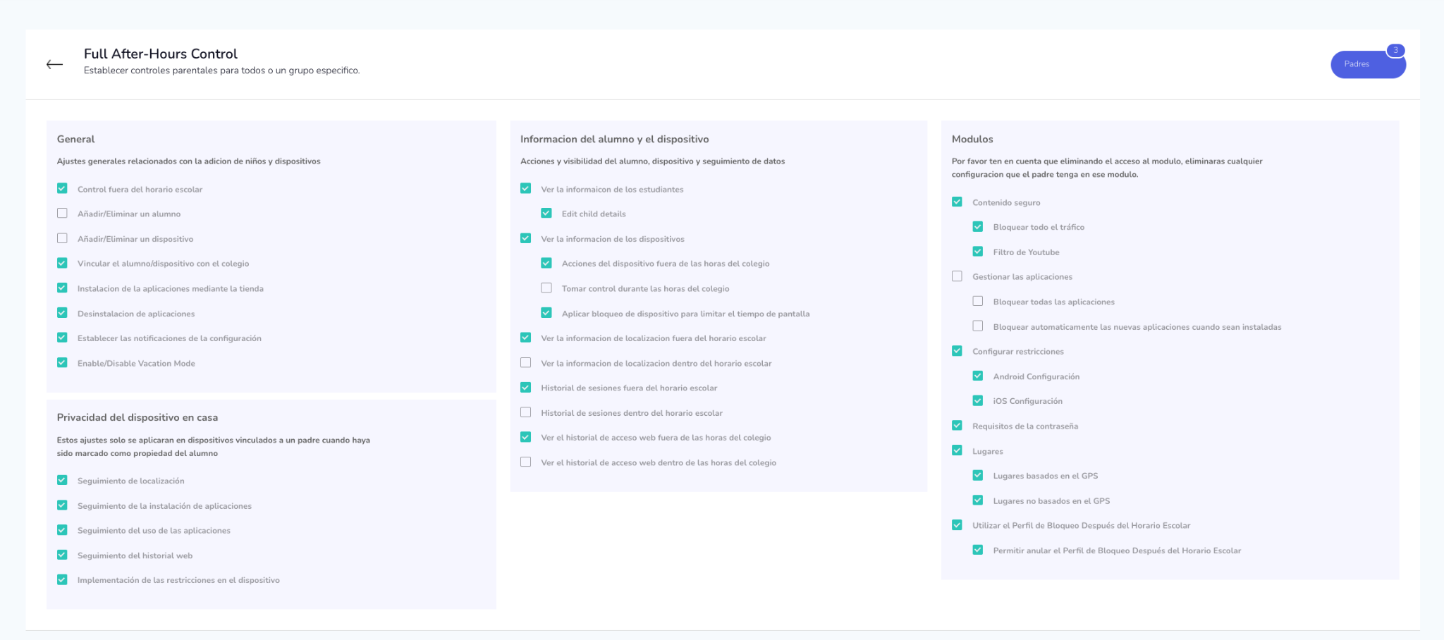 Los administradores pueden gestionar y asignar de manera eficiente los permisos de los padres utilizando estas categorías para controlar y personalizar el acceso que los padres tienen al dispositivo de sus hijos.