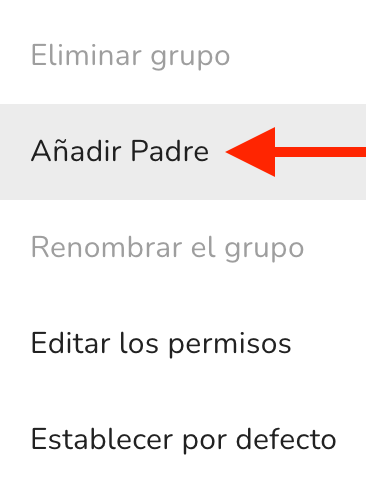 - Haga clic en el menú de tres puntos (kebab) junto al grupo de permisos correspondiente y seleccione la opción "Añadir padre".