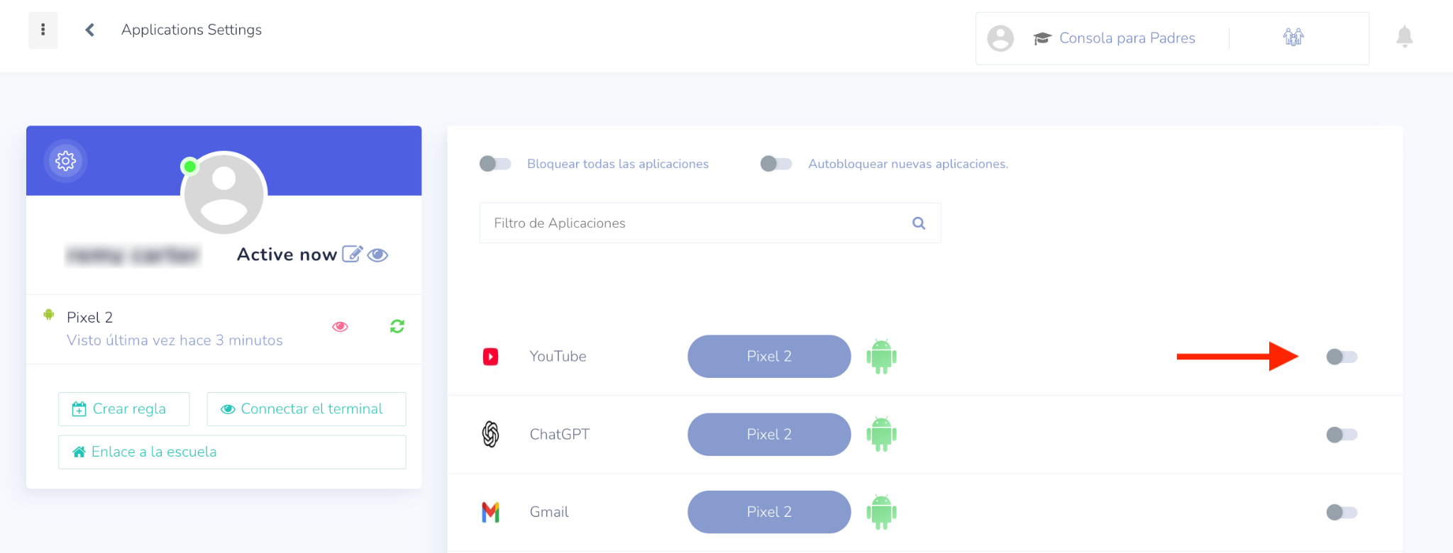 - Haga clic en el botón junto a la aplicación de YouTube para activar el bloqueo de la aplicación.