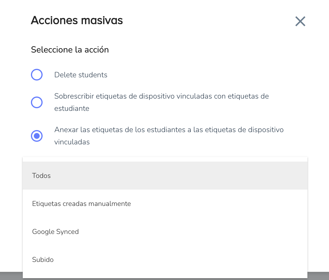 - Propósito: Añade las etiquetas de los estudiantes a las etiquetas de los dispositivos vinculados (todas las etiquetas, etiquetas creadas manualmente, etiquetas sincronizadas de Google o etiquetas cargadas).