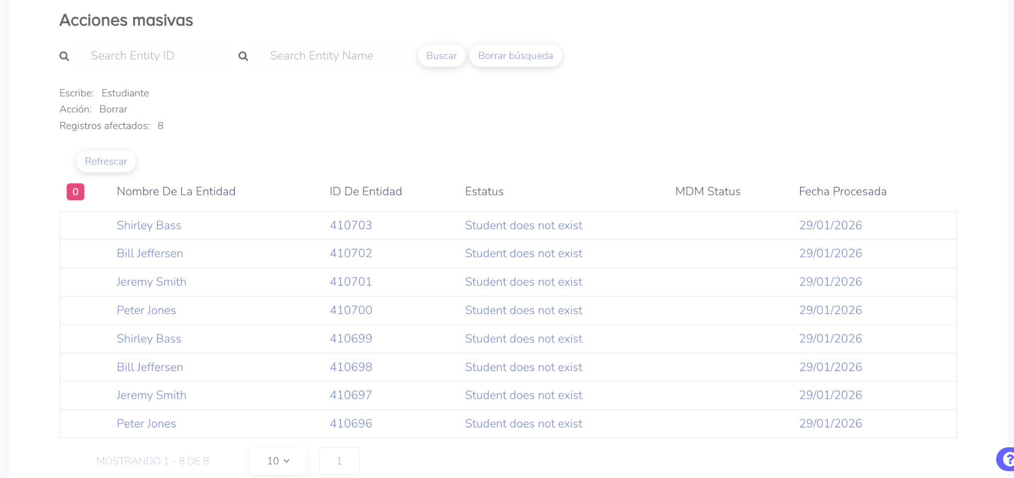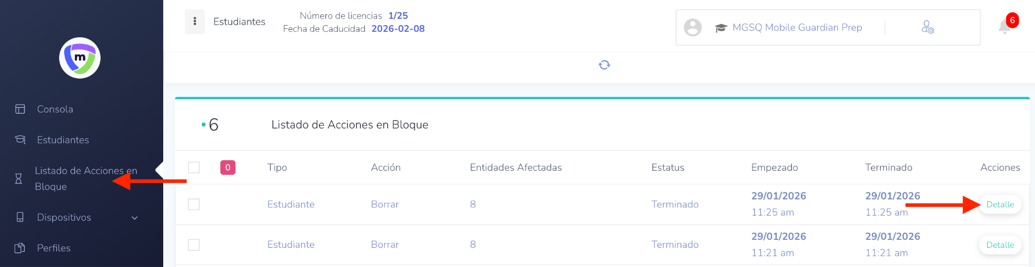 Permite ver el progreso y los resultados detallados de la acción masiva para asegurar que la acción se haya realizado en los estudiantes seleccionados.
