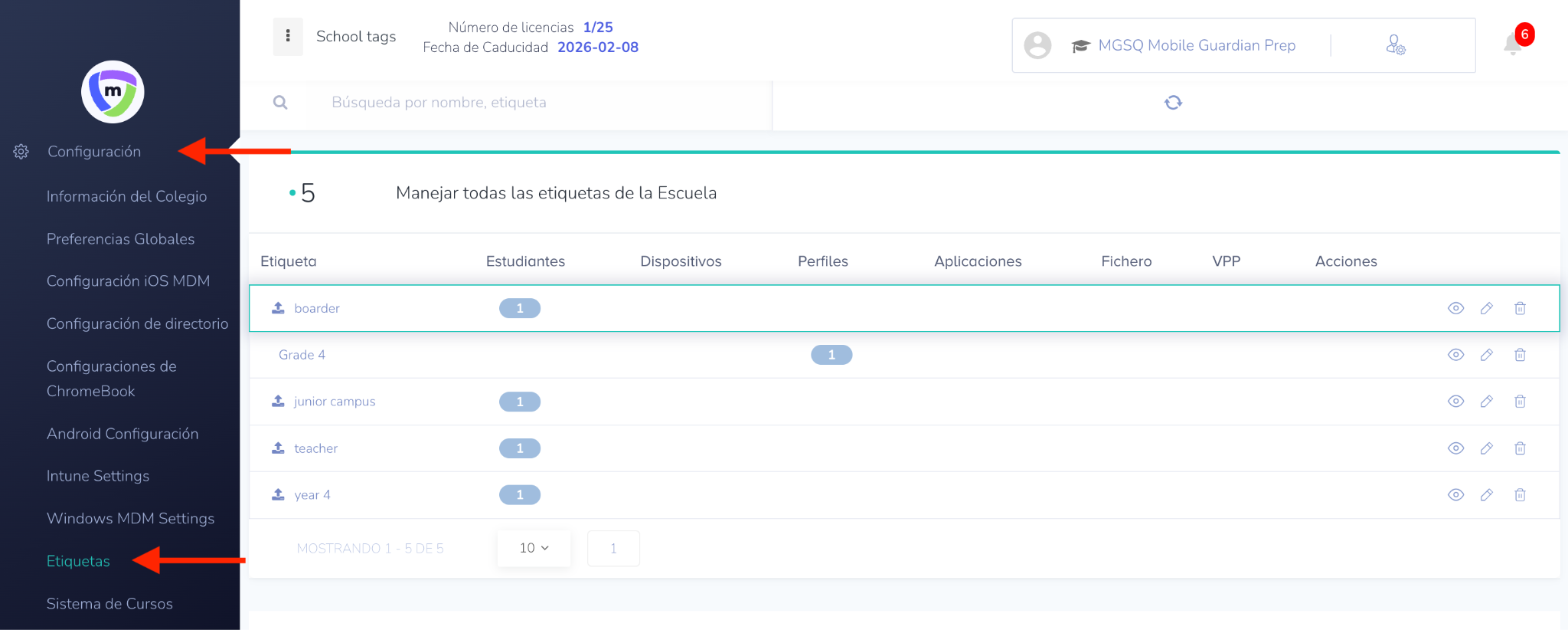 - Propósito: Le permite ver todas las etiquetas añadidas a la escuela, incluyendo las etiquetas añadidas manualmente y aquellas sincronizadas desde Google Workspace.