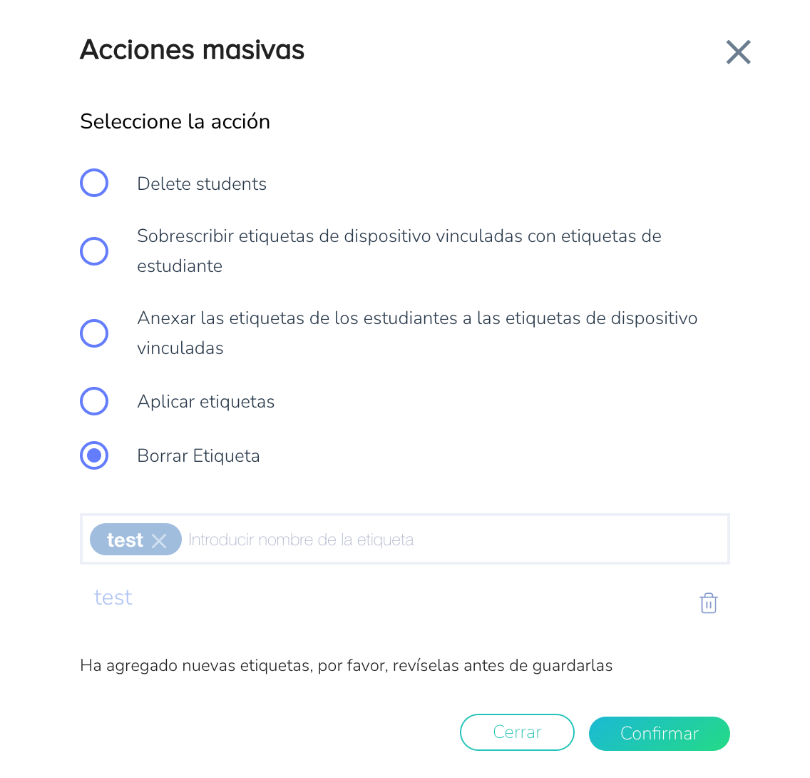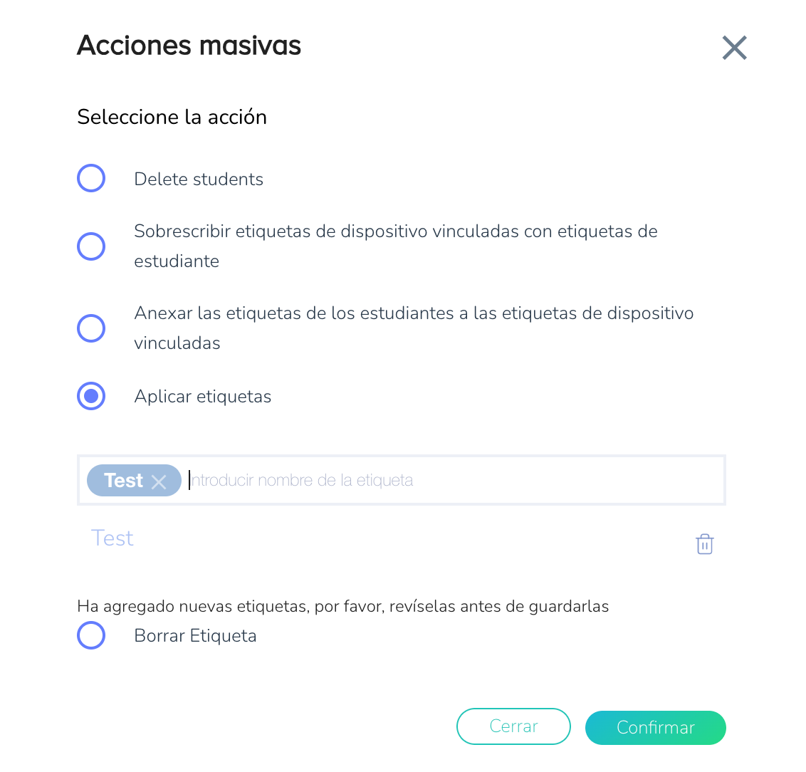 - Propósito: Añade una etiqueta específica de forma masiva a los estudiantes seleccionados.