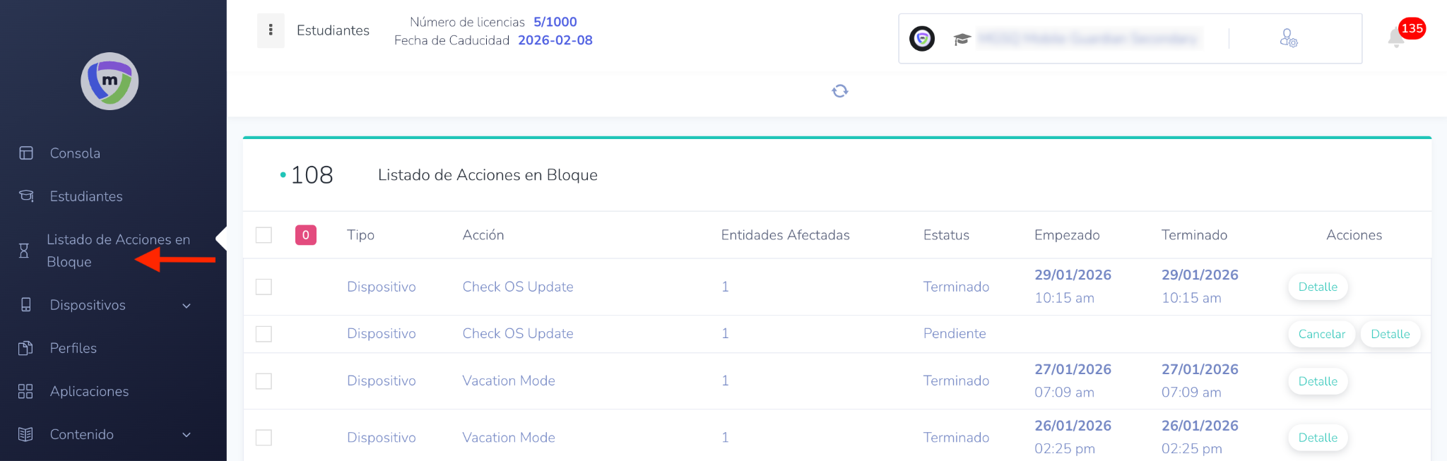- Navegar a la cola de acciones masivas: En su panel de control, haga clic en "Listado de Acciones en Bloque" en el panel de navegación.