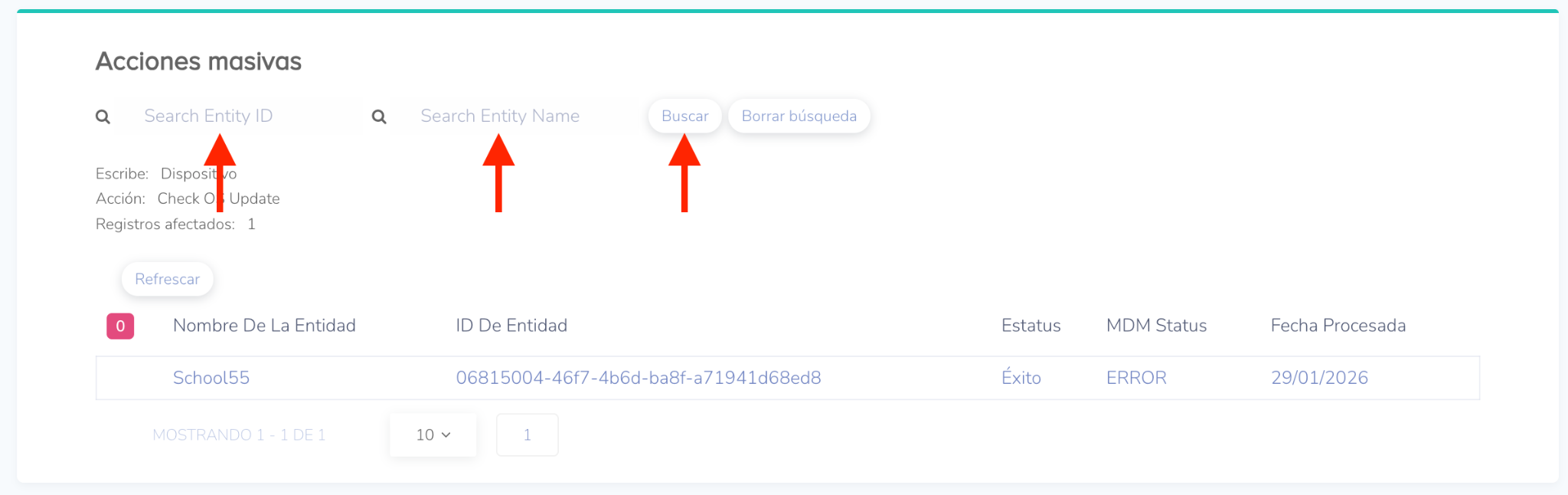 Si necesita verificar el nombre o la ID de una entidad específica dentro de los registros de acciones masivas, puede utilizar la función de búsqueda: