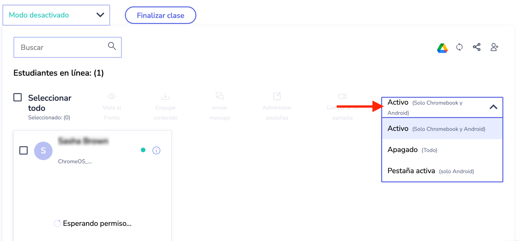 Los profesores pueden cambiar entre los métodos de uso compartido de pantalla durante una clase desde el menú desplegable.